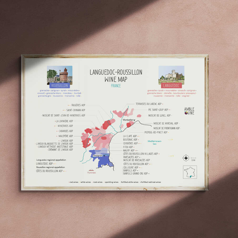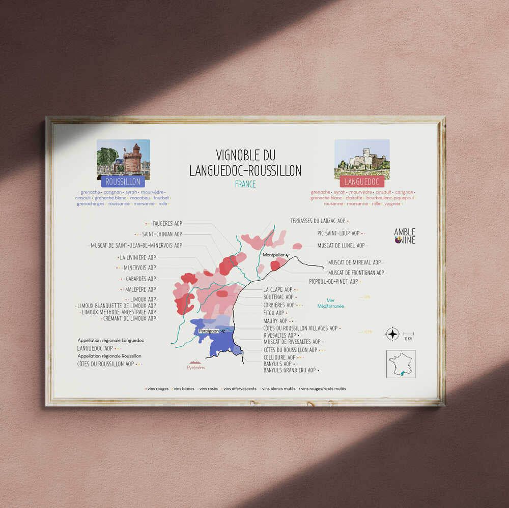 Display the wine map of Languedoc-Roussillon with this large format poster!